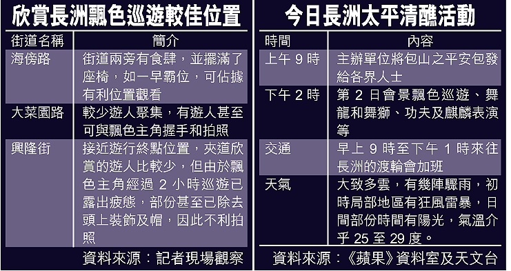 飄色巡遊今天下午2時再度上演,市民不妨在海傍路的食肆邊吃飯邊等候,否則可在3時過後,巡遊隊伍回程時才加入,因為到時人潮漸散,便有機會與表演者合照。