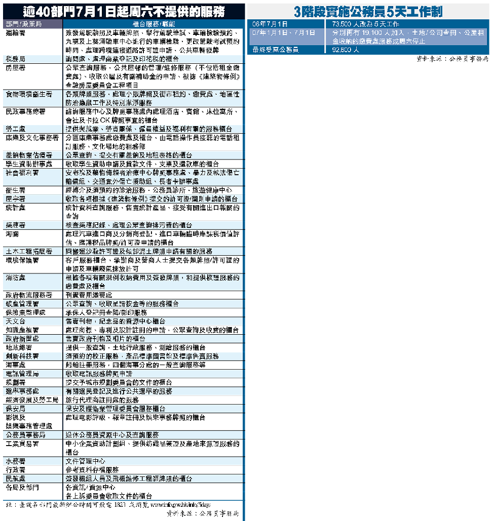 【本報訊】港府今年7月起分階段推行公務員5天工作制,逾7萬名公僕可率先享受周六、周日雙休日。但40多個部門合共逾百項向市民提供的服務,將因此須於周六暫停,受影響的包括運輸署簽發駕駛執照及車輛牌照服務、房屋署的公屋管理和維修服務、民政事務總署18區諮詢服務中心等。港府強調,很多服務可透過郵遞、傳真或熱線電話處理,周六暫停對市民影響不大。 記者:譚暉