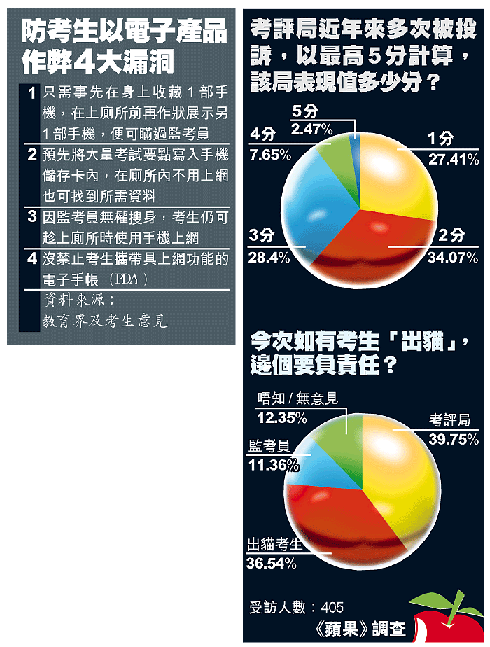 考評局副秘書長張永明昨在立法會教育事務委員會上表示,局方自上周五至今共收到98宗投訴,懷疑因試卷印上試題出處網址,有考生藉故去洗手間利用手機上網出貓。局方及後已加強防弊措施,包括要求考生將手機放於椅底、試場監考員記錄考生如廁時間及可疑情況等。