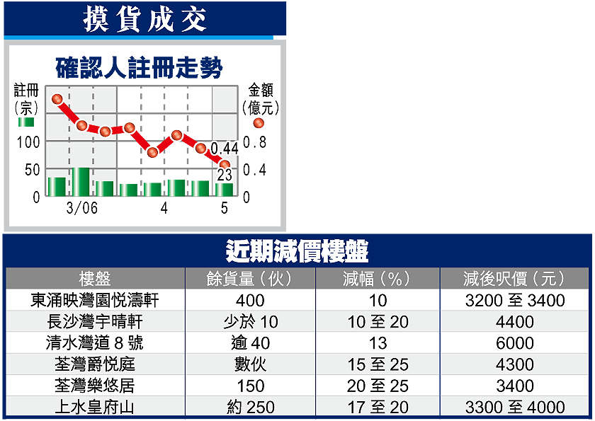 另外,日前出現兩盤價的荃灣區,中原地產營業董事梁寶玲表示,荃灣區同時有新盤開賣及貨尾盤減價,消化大批購買力,二手成交大減,其中減價盤爵悅庭有二手業主加佣促銷,區內其他二手盤也只有零星買賣,多個大型屋苑如愉景新城,過去兩天長假期零成交。