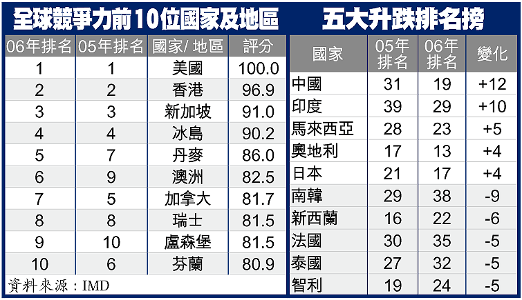 【本報訊】非牟利機構瑞士「洛桑管理學院(IMD)」公布2006年全球競爭力調查,香港力壓新加坡,繼續穩守第二位。至於美國雖然財政赤字達3180億美元,但去年經濟增長仍達3.5%,繼續蟬聯首位。但報告亦指出,香港及新加坡正逐漸拉近與美國的差距。