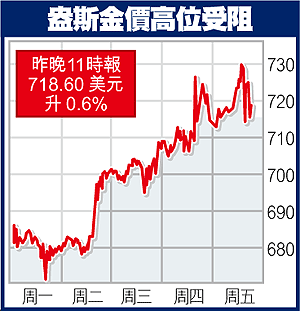 紐約開市後,有投資者趁高沽售貴金屬套現。本港時間昨晚11時,金價報718.60美元,升4.30美元(0.60%);銀價報14.54美元,倒跌29美仙(1.96%);白金價報1328美元,升32.50美元(2.51%)。