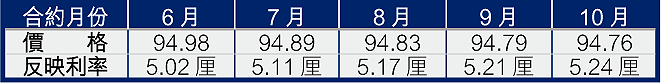 以昨天為例,6月份期貨曾見94.98。若要推算為利率,只需以100減去合約價格,可得5.02厘的數值。若根據附表數字,昨天期貨市場並沒有預期聯儲局6月會再次調加利率。但從較遠期的10月份合約價格報94.76,顯示市場仍相信美國進入今年第4季後息率可能升至5.25厘水平。