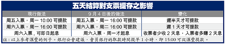 另外,銀行公會昨日亦宣布,本港銀行9月4日起實施每周五天結算,受影響範圍包括港元自動轉賬,港元、美元及人民幣支票結算、以及港元及美元的電子結算。換言之,由9月4日起,結算服務只會在周一至周五進行,周六將停止提供結算服務。