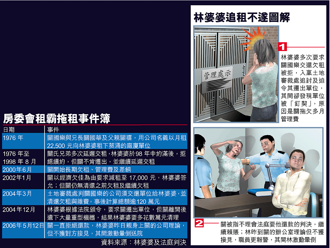 現年80歲的林婆婆,20年前以月租22,500元將葵涌的4,000呎廠廈單位租給關國樂的公司,但對方六年前起再沒有交租,至今共拖欠逾120萬元。她昨晨在女兒與友人陪同下,前往關的寫字樓找他理論被拒,其間職員更報警,患高血壓的林婆婆一時激動暈倒,送往灣仔律敦治醫院診治後已出院。「佢賺咁多錢、咁有學識,唔交租不特止,連見我都唔敢,蝦幾十歲老人家。」林婆婆嗚咽着說。