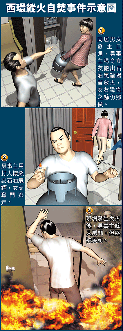 【本報訊】一名失業八年的男子昨日在西環寓所與同居女友發生爭執,喝令女友搬出石油氣罐,揚言要放火一鑊熟,女友驚慌之餘竟照做,並在搬出石油氣罐後奪門報警,惟警方到場時,男事主已開啟石油氣點火,現場迅速陷入火海。消防員疏散大廈數十名住客,經20分鐘灌救終將火撲熄,但單位已遭嚴重焚毀,消防員事後發現男事主已被燒成焦炭。 記者:周志鴻、胡恩宏