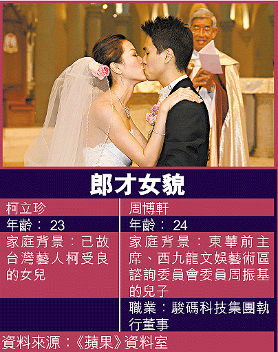 東華三院前主席周振基的兒子周博軒(Felix)昨日與拍拖兩年多的女友、已故藝人柯受良的女兒柯立珍(Jennifer),在中環堅道聖母無原罪主教座堂舉行婚禮,喜宴則於周五(19日)在中環四季酒店舉行。