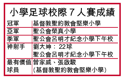 【本報訊】憑張啟駿及曾家威組成的「堅樂小學孖寶」,昨在「全港小學校際足球七人賽」決賽最後一戰,以3:1擊敗聖公會呂明才紀念小學,在採單循環賽制的決賽,以2戰1勝1和得4分奪冠。