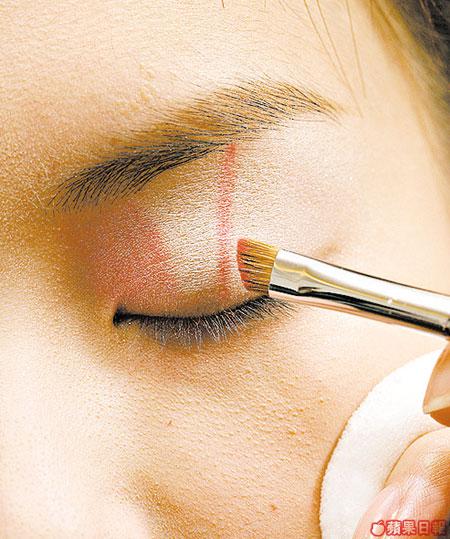 2.以較扁的眼影掃先畫三條紅色線,再填上紅色眼影,放射線會較整齊。