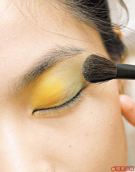 1.如果想妝容不太誇張,可將黃色眼影塗滿整個眼窩,再在突出的欖核位塗上綠色。