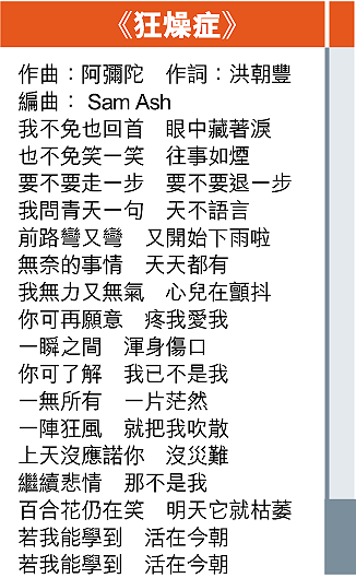 不過最叫人感興趣的,是洪朝豐的新碟原來以自己所患的抑鬱狂躁症為主題,希望透過歌曲唱出他的心聲,稍後派上台宣傳的粵語版《狂風掃落葉》和國語版的《狂燥症》,他有份填詞,當中寫到「一瞬之間,渾身傷口。你可了解,我已不是我」,看來正是他的心聲。