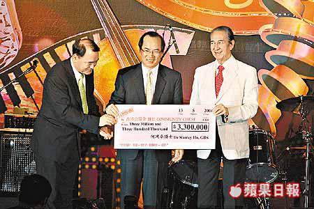 公益金前晚在尖沙嘴洲際酒店舉行「大班獻藝為公益」慈善晚宴,一眾銀行大班及高官包括滙豐銀行亞太區主席鄭海泉、渣打銀行執行董事蘇利民、財經事務局局長馬時亨及九巴董事陳祖澤等,紛紛為慈善獻唱,賭王何鴻燊則慷慨捐出330萬元善款,並包下全場價值80萬元的酒水費用。賭王四位千金超瓊、超鳳、超蕸及超儀(Josie)更偕同湊大她們的奶媽晶姐出席,原來眾女是為了捧父親場,欣賞賭王表演棟篤笑。