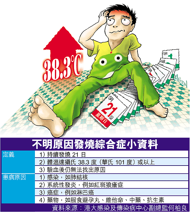 港大感染及傳染病中心副總監何柏良表示,不明原因發燒綜合症是醫學界的大挑戰,很多時病者只出現發燒,沒有其他病徵。大部份個案與感染有關,最常見是肺結核感染;其次是系統性發炎,年輕女性患者多是患上紅斑狼瘡,也有可能是癌症,特別是淋巴癌,有些年輕病人卻又會突然康復。