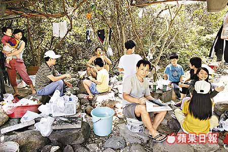 記者沿黃龍坑道走至赤立角村,沒多久便發現這個山澗開闢成的「公眾泳池」。「好正呀,啲水好暖,快啲落嚟啦!」幾名家住逸東邨的小童正在嬉水,玩得興高采烈。11歲的黎偉龍告訴記者,「係全家大細喺度燒烤嗰班阿叔,合力潛入潭底,將大石頭搬到潭邊,啲水至有兩米深!」逸東邨居民阿華歸咎於區內沒有公眾泳池,惟有自行開闢屬於東涌居民的「伊甸園」。