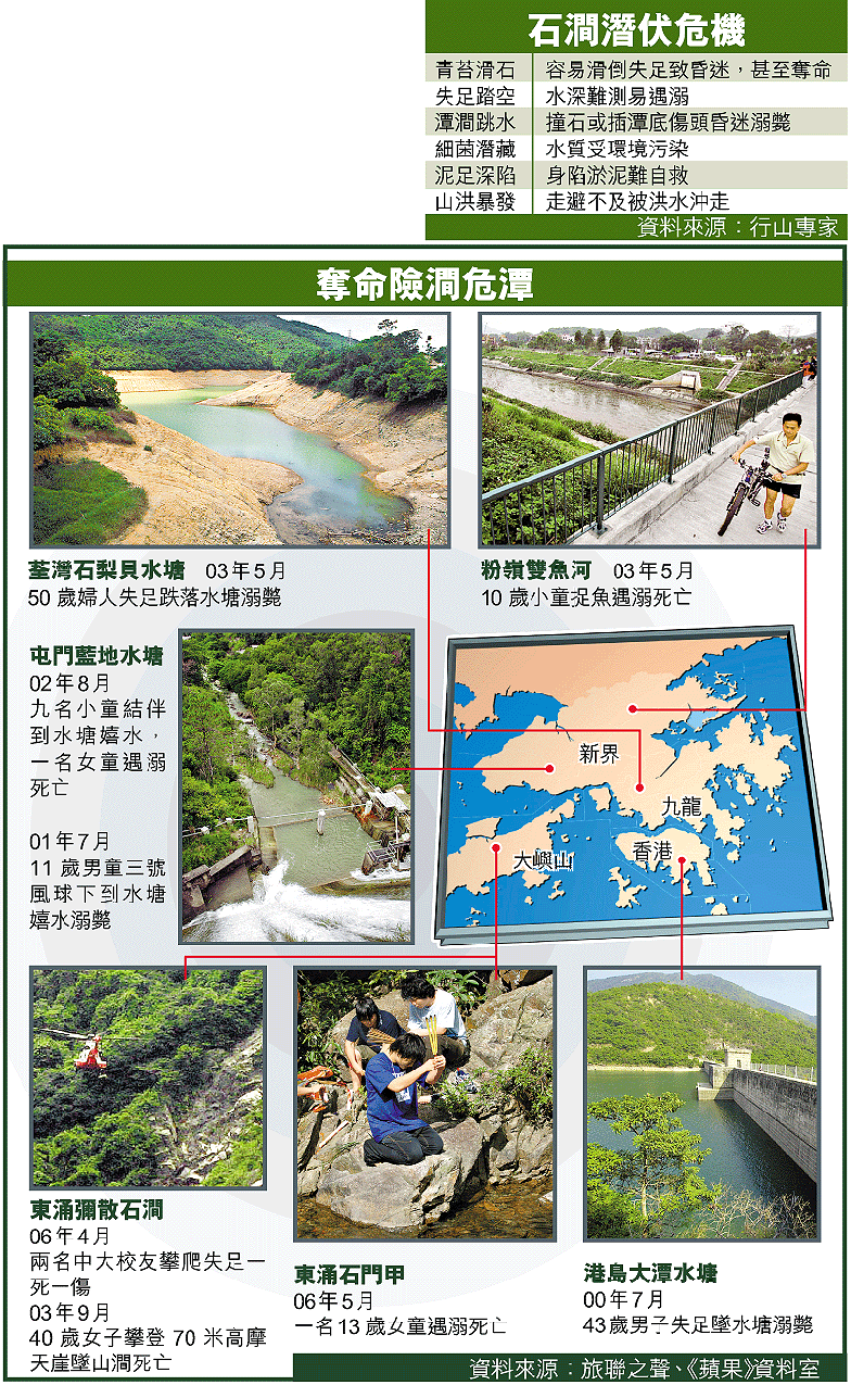 踏入盛夏酷暑迫人,有市民選擇涉足山澗沐浴溪潭;有人非法在水塘區嬉水消暑解熱。遠足專家提醒市民,別誤以為「小澗小流不足為患」,其實景致怡人的險澗危潭潛藏重重殺機。日前發生女童遇溺死亡的東涌石門甲集水區,只有一山之隔的黃龍坑石澗,竟有居民自行堆砌澗石截流成潭興建「公眾泳池」。有行山領隊擔心會把更多無知嬉水的小童送入鬼門關。 記者:林社炳