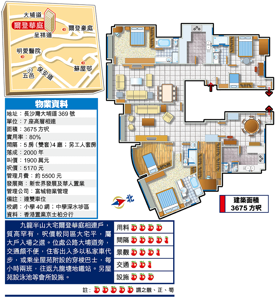 九龍半山低密度住宅,呎價動輒七、八千元,坐落長沙灣大埔道的爾登華庭,現價每呎僅4000餘元,今次介紹一個全屋苑唯一相連戶放盤,面積廣達3675方呎,叫價1900萬元;以同樣銀碼,僅夠買同區嘉柏山2300方呎單位,或筆架山帝景峰帝景臺2400方呎單位。