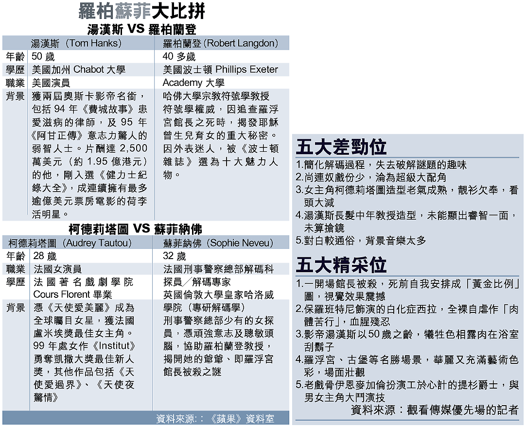 本報記者昨日率先在康城的小劇院SalleDeBussy看了《達》片的傳媒優先場,由於座位先到先得,在開場前一小時已有人在排隊,全院爆滿。《達》片長兩個半小時,電影保留了原著大部份主要情節。小說內24小時的逃亡、解碼過程,要濃縮成2.5小時,劇情難免推展太快,簡化了密碼的謎題及抹去蛛絲馬迹,謎題一出現,往往幾秒鐘後就由主角口中講出破解方法,令觀眾失去了思考的機會,亦失去小說中解謎的樂趣。電影版本指梵蒂岡教廷知道聖盃的存在,與小說中教廷不知情的情節相反。