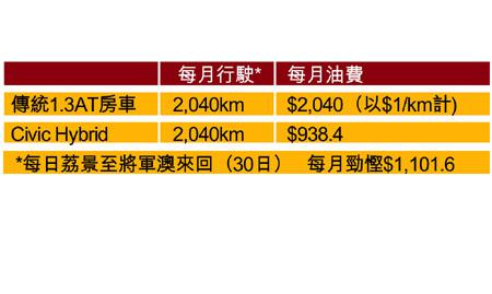 「最怕不是被警察先生抄牌,是快將衝破$15的油價,汽車商立刻引入本田CivicHybrid,混能車慳油,即係慳幾多?每公里$0.46,每公里慳$0.54,長遠襟計,一個月可慳$1,101.6。」