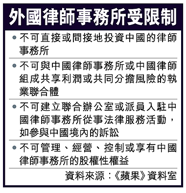 雖然,境外律師事務所在中國經營的業務範圍仍有很大的限制,如不得從事中國法律業務(包括在境內進行訴訟和仲裁等),也不得聘用中國執業律師,以及聘用的「輔助人員」不得為當事人提供法律服務等,但巨大的併購、房地產、企業上市和對外貿易等市場規模,如去年的企業併購高達5,000多億港元,正成為中外律師事務所爭奪的領域。
