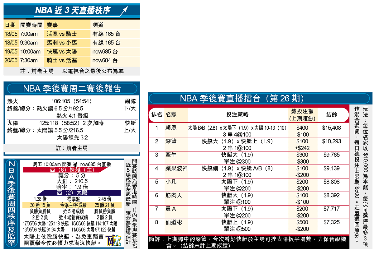 熱火速速擺脫網隊後,決賽將面對活塞與騎士的勝方,目前雙方戰至2:2平手。