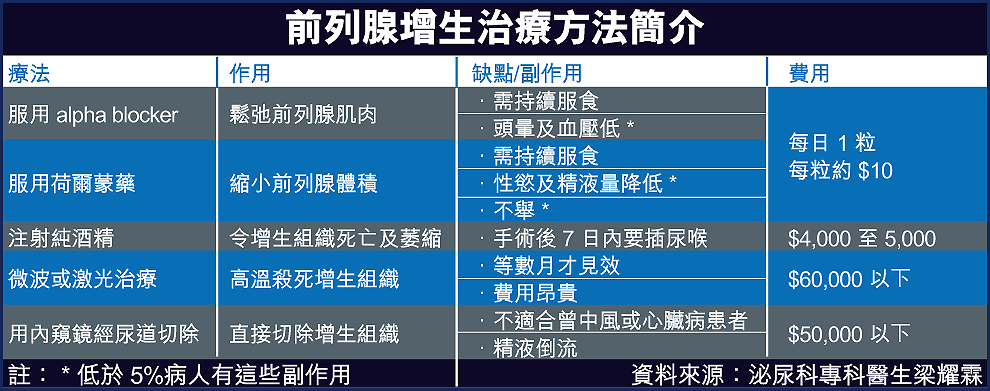 他指出病人若不想「同廁所做人世」,可服荷爾蒙藥Finasteride抑制男性荷爾蒙,令前列腺體積縮小,但有5%病人會有不舉等副作用;屬alphablocker的Alfuzosin及Finasteride則可鬆弛前列腺組織,但會出現令血壓低等風險。