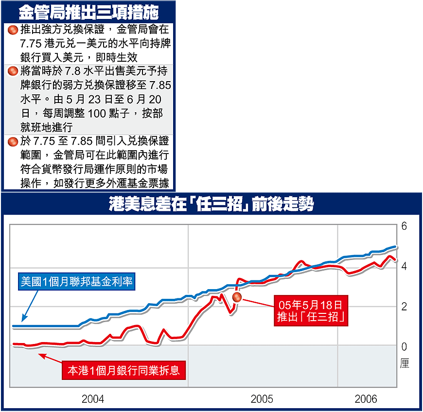 為了趕退借炒賣人民幣升值而流入本地追捧港元的熱錢,一年前的今天,金融管理局突然推出三項聯繫滙率優化措施,令市場始料不及。設計「三招」的金管局總裁任志剛對本報表示,優化措施的推出令港美息差恢復正常關係,「先發制人」(pre-empt)消除了人民幣滙改下,可能對市場構成的潛在衝擊及帶來的「麻煩」,從這個角度看,他認為「三招是成功的」。