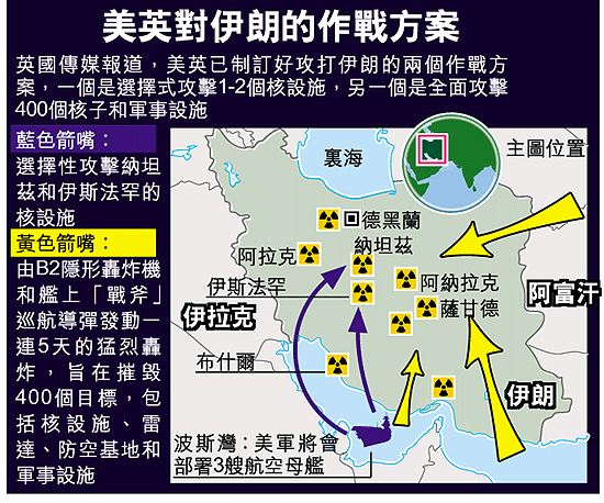 西方國家現時仍努力以外交手段解決伊朗核問題,但英國有傳媒前天(周二)披露,美國國防部消息人士指出,若外交努力失敗,美國準備更新應急作戰方案攻擊伊朗。據英國《格拉斯哥先驅報》報道,美國戰略策劃人員已提交兩個攻伊方案,一個是連續五天狂轟濫炸伊朗,一個是集中手術式轟擊一些核設施目標。