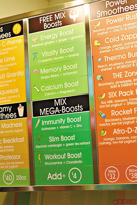 以健康為主,上環FitnessFirst內只有一間Mix,亦係全港唯一一間開設喺FitnessClub嘅Mix。主要售賣果汁三文治類食物,而且有埋專為健身人而設嘅特別服務──喺飲品度加補品!補品當然唔係人參、海味,加落去果汁度嘅補品分別可以補充體能、維他命、鈣質,另外仲有專為收身或變大隻而設嘅健體粉,飲果汁兼補一補,舒服晒。最緊要係所有Mix嘅食物都會列明卡路里,等你計掂條數先放入口,罪惡感無咁重囉。