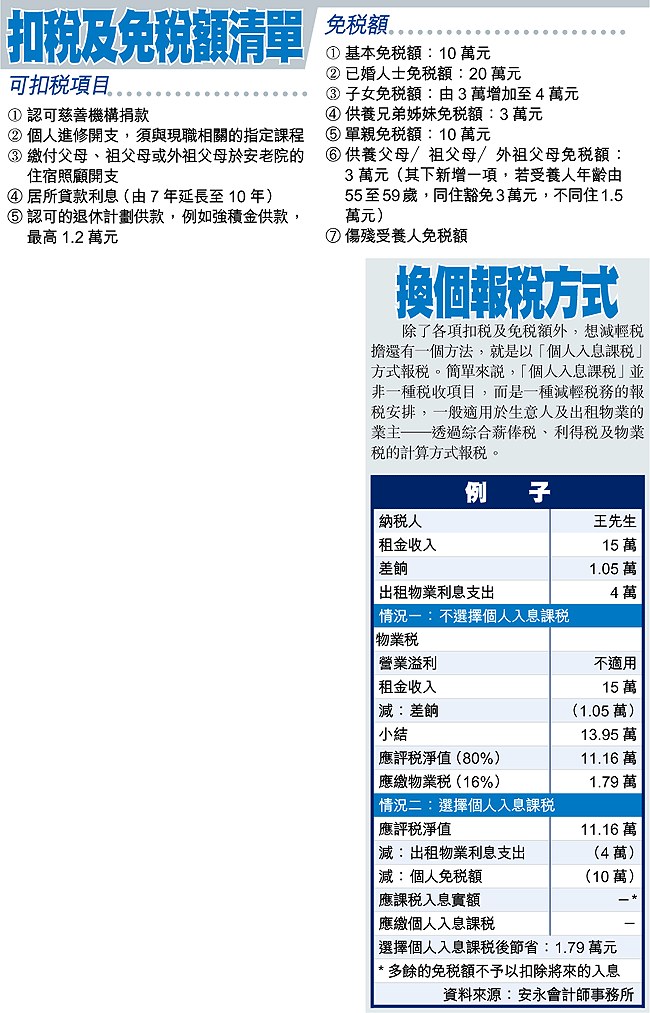 她續說,居所貸款利息減免現由7年延長至10年,雖然法例還未通過,但今年報稅已可用;若然報稅人是第8年申報此減免,不應填漏。除此之外,個人進修開支、認可的慈善捐款及認可退休計劃供款,例如強積金供款也可扣稅。
