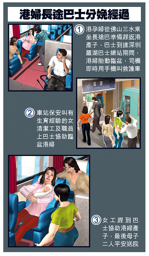 【本報訊】深圳消息:一名跟隨港人丈夫返廣東佛山居住的港人孕婦,前日隻身從佛山坐長途巴士趕返港產子,不料巴士到達羅湖火車站期間,孕婦提前胎動臨盆,在兩名婦人幫助下順利在巴士上誕下一名男嬰,母子平安。產婦事後對於在距離香港境五分鐘路程的深圳羅湖產子深感無奈,因為按目前兩地制度,該名男嬰不能在香港申請出世紙。
