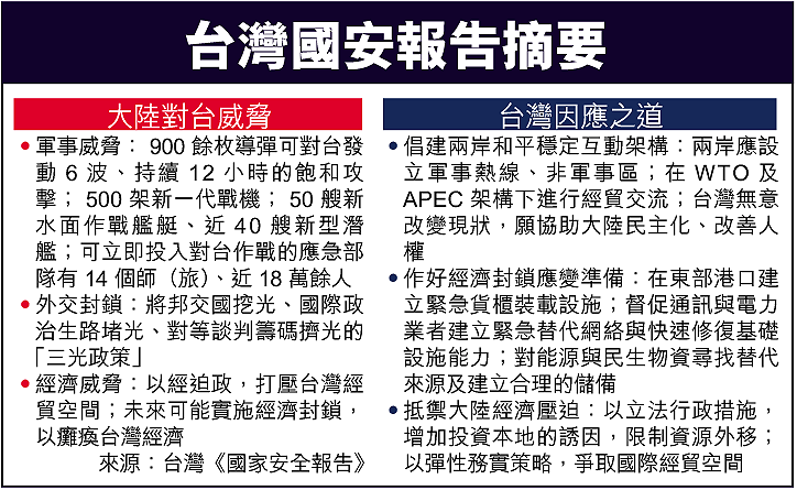 報告在羅列大陸對台灣的各種威脅時提到,台灣的財經安全深受中國威脅,2005年台灣對中國大陸(含香港)出口佔出口比重已達37.8%,經核准對大陸投資金額佔台灣海外投資總額71%。台灣資訊通訊產品幾乎四分之三都外移大陸生產,造成本地投資低迷,就業機會劇減,結構性失業現象惡化,受僱勞工薪資所得也難以提升。
