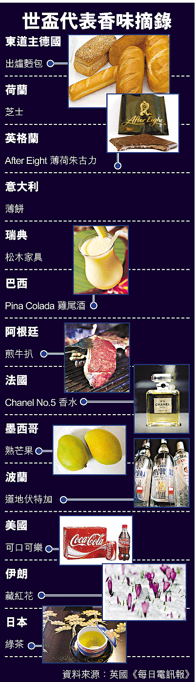 世界盃尚有19天就開鑼,32支世界勁旅雲集德國,盡展渾身解數,為雷米金盃(JulesRimetTrophy)爭個你死我活。球隊離鄉背井作賽,倘若能有家鄉味道作伴,儼如一支強心針,自然踢得更起勁,東道主德國一個香水小鎮,為了解決球員、球迷和遊客的思鄉之情,推出「世界盃之味」,以不同香味代表各隊,招攬遊客到當地尋香探味,為當地製造更大商機。