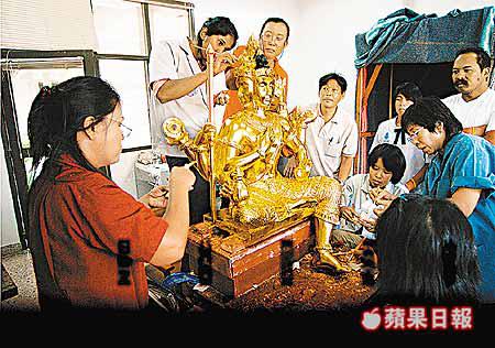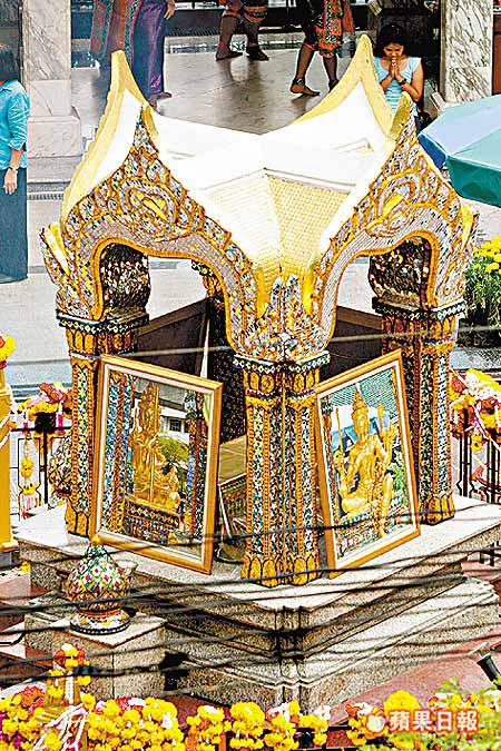 月前遭破壞的曼谷四面佛復修完成,開光及歸位儀式今日舉行,信奉四面佛的狄波拉特地帶團參加盛會,而拉姑前夫謝賢,昨日帶新女友到曼谷跟前妻拉姑會合時,竟又跟粵語片年代老相好嘉玲碰上,新歡舊愛濟濟一堂,四哥三面逢源,好不熱鬧。