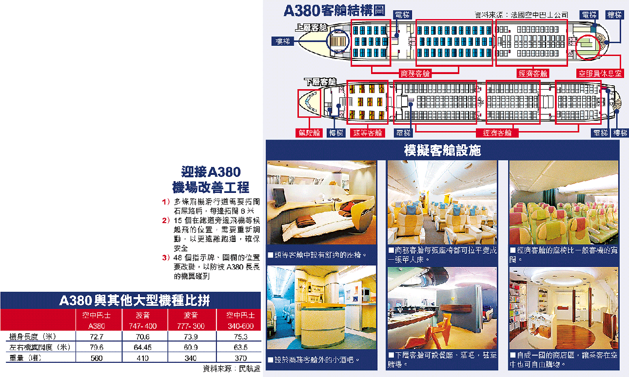 全球最大的空中巨無霸空中巴士A380,港府預料最快本年底首度來港,屆時本港旅客將可登上這架巨型的空中「雙層巴士」。由於本港機場預留了距離客運大樓最遠處的五個大型航機泊位,加上每架A380一般可載客多達逾500人,屆時乘客需及早抵達機場以便準時登機。 記者:譚暉