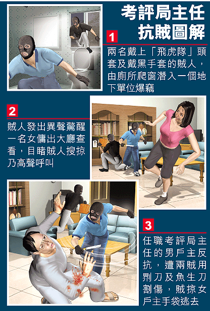 【本報訊】考試及評核局通識教育科科目主任盧家耀,其位於沙田火炭麗峰花園的寓所,昨晨遭兩名以「飛虎隊」頭套蒙面的持刀賊人潛入爆竊,盧家耀抗賊時雙手受傷,賊人恐事敗,匆匆掠去盧妻一個內有數百元現金及一部手機的手袋,沿廁所爬窗逃去無蹤,傷者事後報警送院救治。 記者:黎志偉