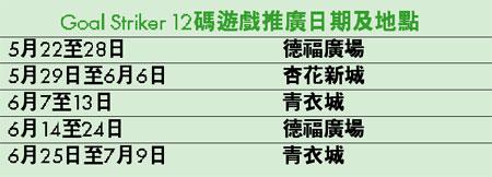 GoalStriker會巡迴安放在德福廣場、青衣城及杏花新城內,大家須在場內購物滿$200,憑即日單一發票便可免費玩GoalStriker12碼遊戲一次,又或是即場捐助$30予保良局兒童家舍,亦可玩一次。每星期主辦單位會選出最高分的一位,便有機會贏得$1,000運動品購物券。