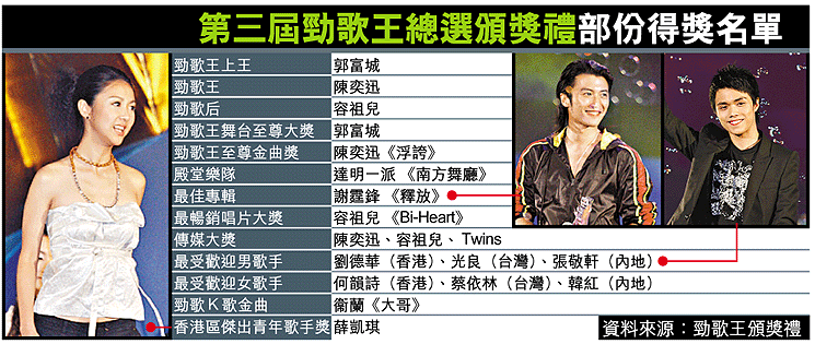 前晚假廣州天河體育館舉行的《第三屆勁歌王總選頒獎典禮》,郭富城獨攬五大獎,其中「勁歌王上王」更是全場大獎,陳奕迅、容祖兒及Twins各得四個獎排第二,但排場卻比城城差一大截。