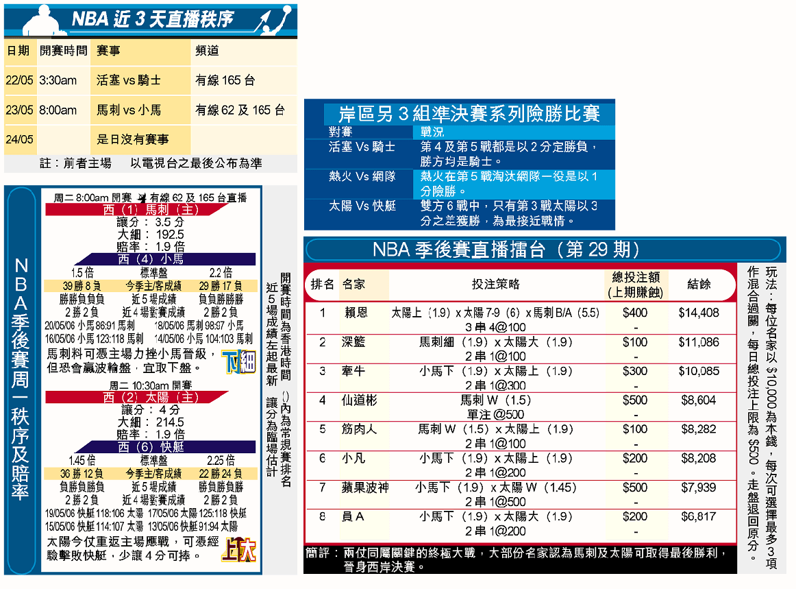 聖安東尼奧馬刺及達拉斯小馬將於周一上演德薩斯州「雙馬」大廝殺,在7場4勝制的西岸準決賽最後一戰作生死決;經過之前6場扣人心弦的對決後,馬刺能否成為NBA歷來第9支從落後1:3逆境反敗為勝的球隊?而小馬又會否最終重蹈湖人上階段「臨尾香」的覆轍,周一自有分曉。(有線62及165台明日8:00am直播)