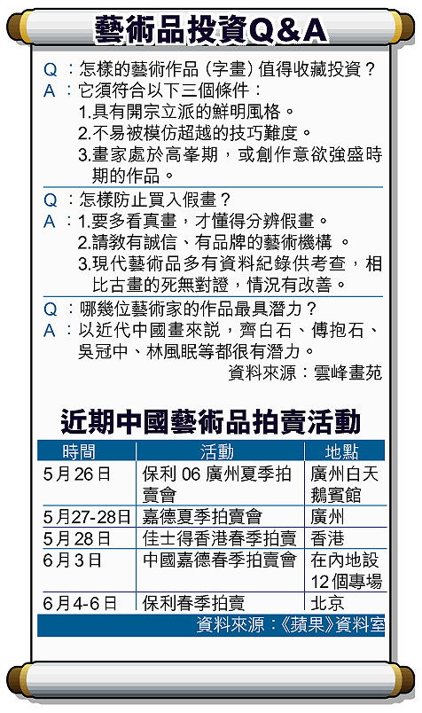 04年下半年,有人以20多萬元買入林風眠的畫,並在去年拿到春季拍賣會,以200多萬賣出。他表示,過去20年,中國藝術品每年都以20%至30%的幅度飆升,是因為價格起點太低,藝術精品距離應有價值有很大距離。