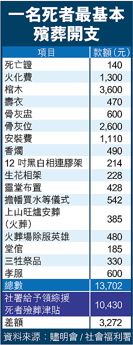 【本報訊】孤苦無依的獨居長者,靠着微薄的綜援金熬過淒酸晚年;臨終時盼望在小小的靈堂,體面地讓親友送別,卻因綜援金的殮葬津貼金額太低,未能滿足這卑微心願。有長者走得沒半點尊嚴,靈堂設在陰森的入殮室、遺照被隨便置於地上、壽衣欠奉,甚至衣不蔽體蓋棺火葬,連骨灰也無處容身,帛金還須上繳社會福利署。立會檢討綜援小組今日將討論應否增加有關津貼。 記者:雷子樂