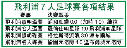 日本代表浦和紅鑽,昨日假港會球場舉行的「飛利浦照明國際7人足球賽」,先後淘汰愉園及凱沙領袖殺入決賽;在冠軍爭奪戰中,浦和紅鑽憑射手木村祐也加時階段射入黃金入球,協助球隊以1:0擊敗維拉,成功衞冕盃賽錦標。