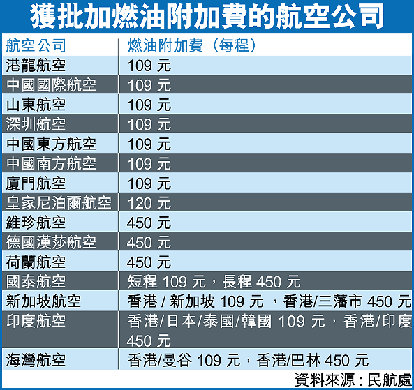 【本報訊】民航處宣布批准15間航空公司的燃油附加費申請,普遍加幅約21%,加幅最高的是印度航空公司來往香港至印度的附加費,由250元加至450元,加幅高達八成。至於國泰航空短程收費由90元加至109元,長途機則由370元加至450元,而港龍航空每程附加費也加至109元(見表)。