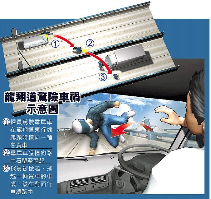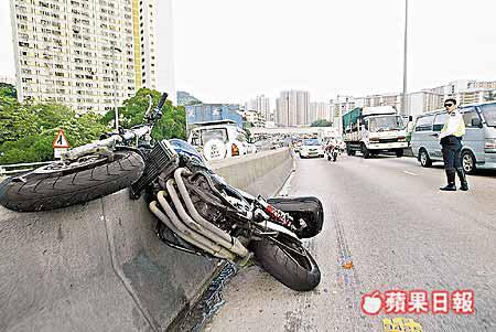 據目擊者稱,當時一輛客貨車正沿快線行駛,而電單車在切線時失控撞向客貨車的車頭,然後連人帶車如同炮彈般飛過路中一米高的石壆,電單車擱在石壆上,鐵騎士在半空中飛過西行線一輛50噸重貨車的車頭,然後跌在馬路上,頭盔飛脫,頭破血流。