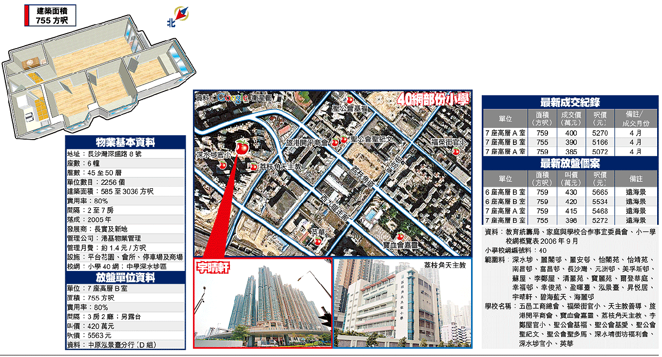 中原羅敬樂表示,宇晴軒6、7座A、B室,面積700餘方呎,間隔3房1廁,屬屋苑中型單位,這類放盤約20個,平均呎價4700元。介紹單位樓層極高,同類放盤約5個,盤源珍貴,故叫價每方呎逾5500元。