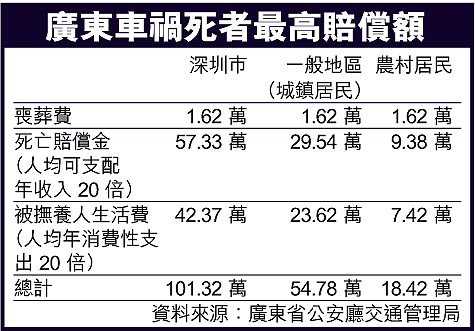 在內地不幸遭遇車禍,受害者賠償金「同命不同價」。根據廣東省最新出台的交通意外賠償標準,在深圳巿發生的交通意外,若受害者身亡或被造成最高級別傷殘,且在事故中無任何責任,擁有深圳戶口者最高可獲肇事者賠償101.32萬元,但農村居民只能獲得18.42萬元,兩者相差近83萬元。