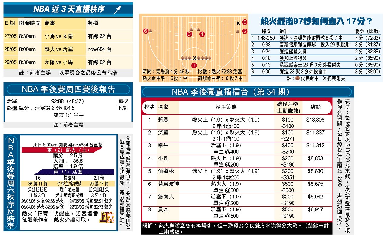 下半場,熱火外投未有太大改善,一度落後18分;雖然在最後的1分46秒,熱火在獲迪帶動下,於97秒內狂轟入17分(見附表),尤其在完場前9.8秒獲迪3分球命中後,更一度將差距縮窄至88:90,可惜最後比立斯兩罰皆中,加上亨打成功從獲迪手中奪走皮球,粉碎熱火從後趕上的希望。