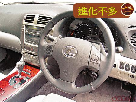 還記得上一代IS200的車廂最出位是甚麼嗎?當然是那個如手錶一樣的錶板,今代雖沒有用上同樣的設計,但錶板一樣靚到無倫,轉數及速度錶內各有個源自賽車設計的環形警告燈,當到達設定的轉數及速度後,錶板會亮起橙色的警告燈,如再高一點便變成紅色。此外,軚環後亦設有轉波用的撥片,不再是按鈕形式,左減右加使用起來更方便。空間方面,IS車系由於是部小型的FR房車,因此不可以對它的後座有太大的期望,中央的傳動軸凸槽很大,中排乘客少不了要屈膝而坐,但整體的空間仍比上代出色。