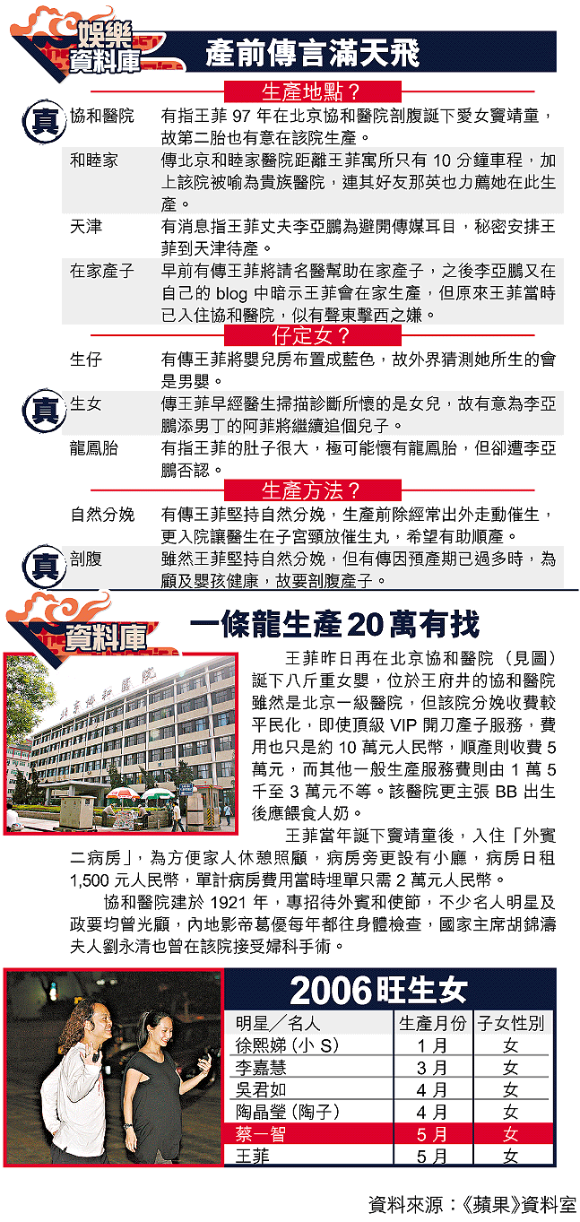 王菲大前晚約11時在丈夫李亞鵬陪同下,乘坐一輛白色七人車抵達北京協和醫院外賓樓,並在10名保安護送下入院,至昨日早上王菲剖腹產女,李亞鵬都一直留在醫院陪伴愛妻。王菲經理人陳家瑛昨日向本報證實王菲誕女的消息,她在電話中說:「王菲今日生咗,係開刀生嘅。」問到BB女何時出生?她說:「總之係今朝生嘅,母女平安,佢成家人都好開心,個女重八斤(內地重量單位為斤,一斤即0.5公斤或1.1磅)。」