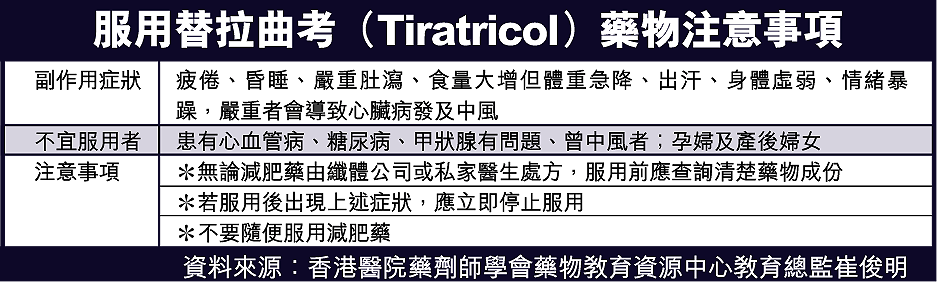 【本報訊】炎炎夏日,女士們都希望以完美體態示人,或會服用減肥藥達致瘦身效果。香港醫院藥劑師學會藥物教育資源中心發現,近期在法國多人因服用含動物甲狀腺素「替拉曲考」(Tiratricol)成份的減肥藥物,導致死亡或需入院治療,有關藥物在港也有發售,每月銷量超過20萬粒,估計有數以千計港人正藉此減肥。在過去三年,本港已有四人在服用此藥後需入院治療。 記者:謝明明、黃嘉寶