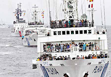 日本、美國、俄羅斯、南韓和加拿大海軍昨天在東京灣舉行五國海上演習,演練海上堵截大殺傷力武器,模擬海上保安廳隊員截停「可疑」船隻時,擎槍指嚇船上人士(圖一),其他人士則在海上保安廳的船隻上觀看(圖二)。本來中國也派部隊參加,但前天突然表示部隊另有任務,無法參加,外交界人士透露,中國擔心演習會得罪北韓,妨礙六方會談重開。 路透社